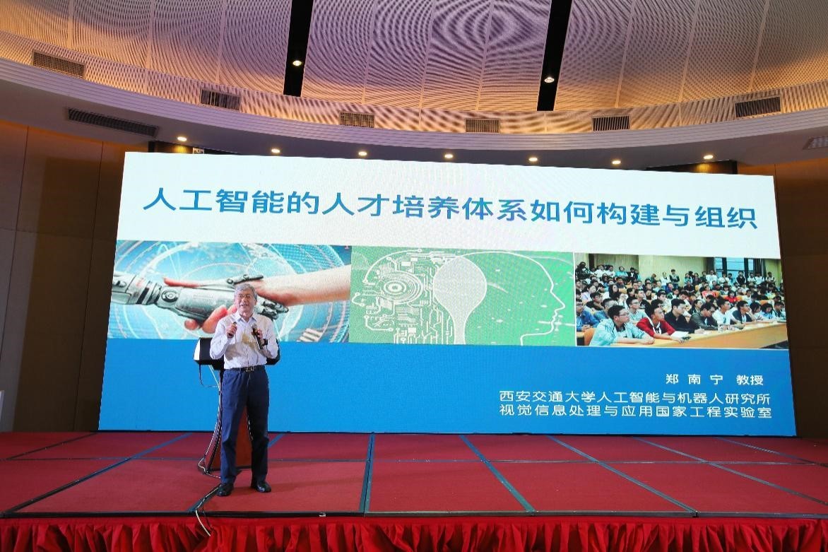 在成立大会上,郑南宁院士做了题为“人工智能的人才培养体系如何构建与组织”的主旨报告,强调了当前人工智能教育的重心和发展方向,得到了与会单位代表的热烈响应。